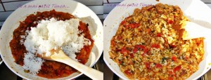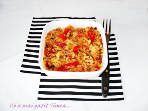 Orezul fiert, scurs de apa il adaugam peste legume si amestecam bine. Daca mai e nevoie mai condimentam.