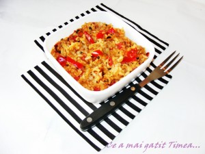 I-am zis ‘ legume cu orez’ si nu orez cu legume pentru ca are la baza muuuuulte legume proaspete :). Foarte buna mancare pe timp de vara si toamna cand inca putem profita de rosii, ardei si vinete de gradina.