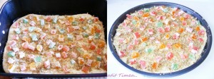 Ungem fiecare foaie de aluat cu acesta smantana apoi presaram nuca si asezam rahatul taiat cubulete. (pentru a putea taia mai usor rahatul il dam prin zahar pudra).