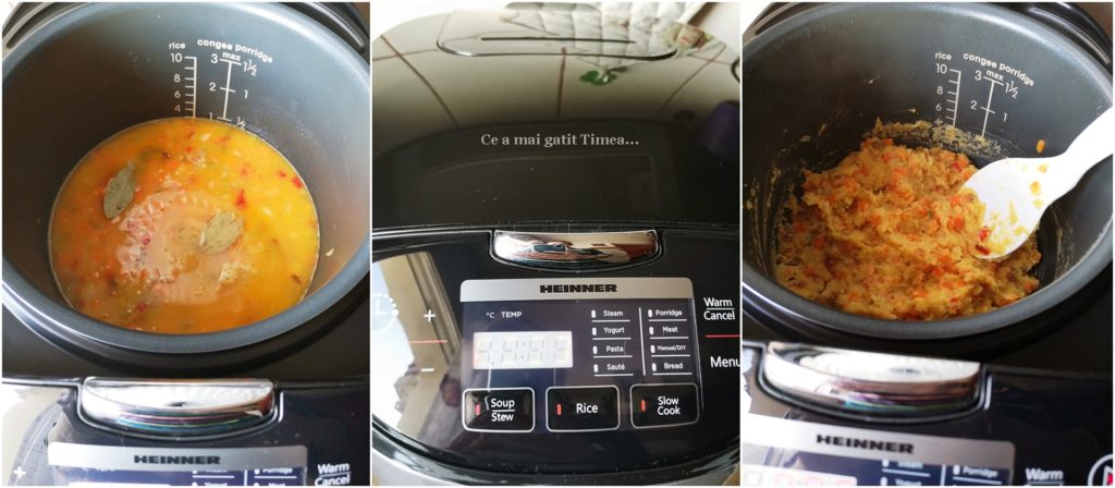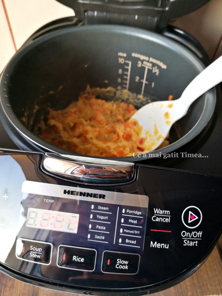 Sunt aici prezenta sa va prezint un nou ajutor din bucataria mea si anume, aparatul electric Multicooker de la Heinner. Este un aparat care imi usureaza munca in bucatarie, pentru ca o data puse ingredientele in vasul aparatului, nu mai am nimic de facut, nu trebuie sa fiu atenta sa nu se arda, nu trebuie sa amestec, nu murdaresc nimic in jur si nu am miros puternic de mancare in casa. In plus, are o multitudine de functii, de la tocanite la supe, de la gatit carne la facut paine, una peste alta vreo 11 functii si una minunata, aceea de a pastra mancarea calda o data ce programul de gatit s-a terminat.