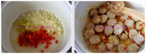 Tocam ceapa si ardeiul si il punem la calit in uleiul incins. Adaugam si thuringerul taiat si mai lasam la calit cateva minute..
