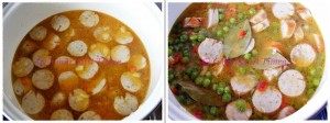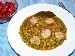 Turnam apoi apa fierbinte si lasam sa fiarba moment in care adaugam mazarea congelata. Adaugam sare si piper dupa gust si 3-4 foi de dafin si lasam sa fiarba la foc mic.
