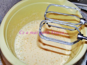 Mixam ouale intregi pana se deschid la culoare. Adaugam zaharul si mai mixam cateva minute.