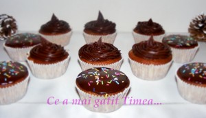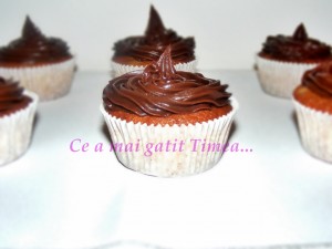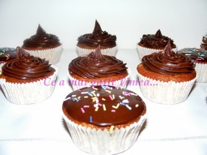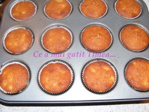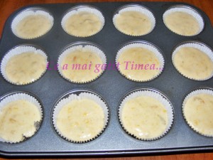Asezam cosuletele de hartie in tava pentru muffins, le umplem de trei sferturi si dam la cuptorul preincalzit la 175 grade timp de 25 – 30 minute.