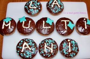 Pt ornat am folosit ciocolata alba topita in care am pus o picatura de colorant albastru.