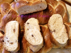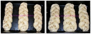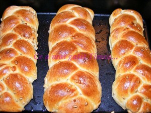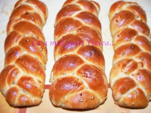 Am facut trei painici impletite. Le lasam si pe acestea sa se ingrase putin, le ungem cu ou si la fel le dam la cuptorul incins, dar doar timp de 25 min. Sunt mai subtiri si se coc mai repede (cel putin asa se intampla la mine in cuptor 🙂 )