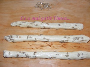 Pentru painea impletita am uns masa de lucru cu putin ulei unde am format suluri pe care le-am dat apoi prin semintele de floarea soarelui.