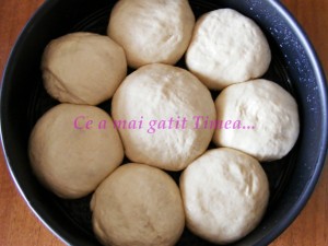 Pentru painea floare am format bilele si le-am pus intr-o tava tapetata cu ulei. am pus 7 bile de jur imprejur si una putin mai mare in mijloc.