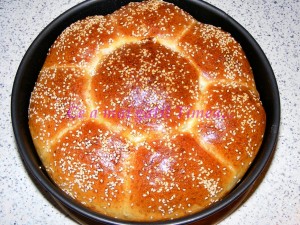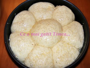 Lasam la dospit din nou pana isi dubleaza volumul. Ungem cu galbenus de ou si presaram seminte de susan.