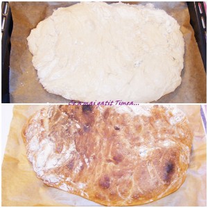 Am facut o si eu dar a fost foarte greu cu manevratul, fiind atat de lipicioasa. Si inca nu stiu cum pot rasturna aluatul in tava cu fata in sus, e moale si se lipeste de vasul in care a stat la dospit. :((