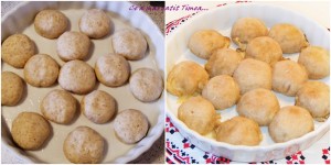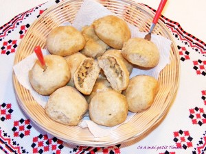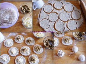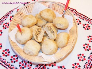 Punem in fiecare cerc cate o lingurita cu varf branza de burduf si o lingurita cu varf ciuperci. Strangem marginile cercului spre mijloc si apasam cu degetele sa se lipeasca, apoi formam cu mana bile si le asezam cu partea adunata in jos intr-o tava unsa cu putin ulei. Procedam la fel cu fiecare.
