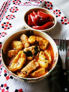 Cand carnea este fiarta adaugam inca o cana de apa fierbinte si in momentul in care fierbe, cu o lingurita luam din pasta de ou cu faina si formam galustele. Lingurita o trecem de fiecare data prin apa de la tocanita.