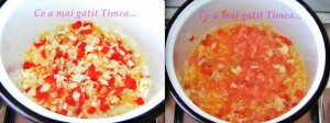 Curatam ceapa si ardeiul, tocam marunt si calim in cateva linguri de ulei. Adaugam rosia decojita si tocata marunt si lasam pe foc inca aprox 3 min ametecand sa nu se arda.