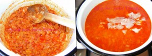 Luam de pe foc si adaugam cele doua lingurite de paprika. Umplem apoi vasul pe jumatate cu apa si punem inapoi pe foc. Cand fierbe apa adaugam carnea taiata. (am taiat pulpele in doua)