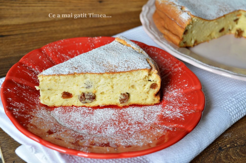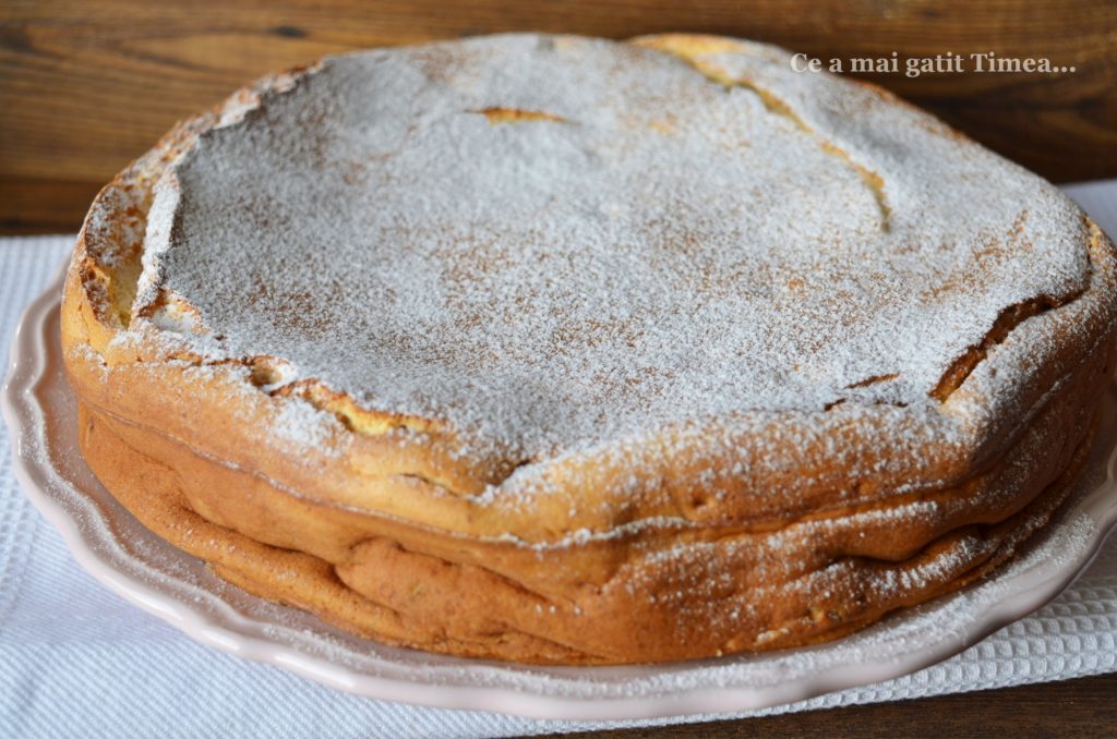 - Turnam compozitia intr-o forma rotunda de 26 cm unsa cu unt si tapetata cu faina si dam tava la cuptorul preincalzit la 180 de grade timp de 15 minute apoi reducem temperatura la 150 de grade si mai lasam aprox 40 minute. Dupa ce am oprit cuptorul am mai lasat pasca in cuptor, aprox 10 minute, cu usa deschisa.