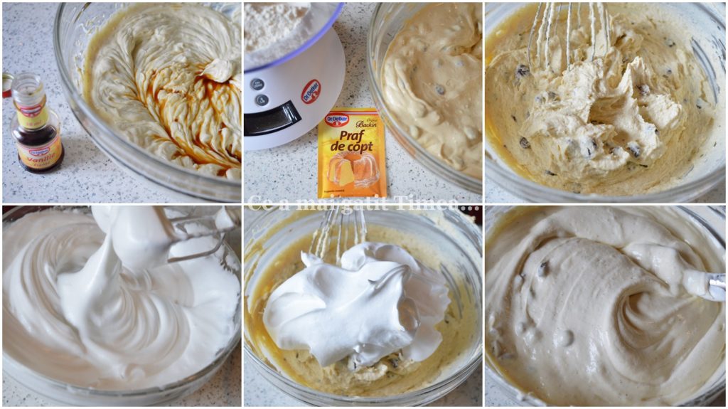 - Incorporam, cu ajutorul unui tel, faina amestecata cu praful de copt si un varf de cutit de sare.