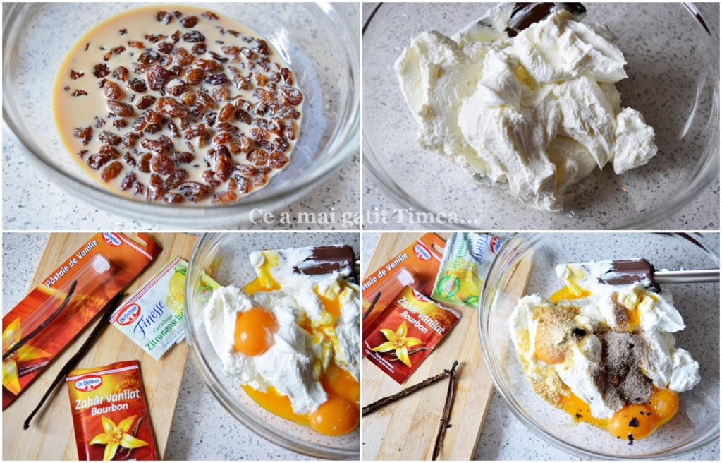 - Mixam compozitia adaugand apoi si stafidele hidratate impreuna cu lichidul in care s-au hidratat si daca mai e nevoie de un pic de aroma de vanilie in plus, inca o lingurita de esenta de vanilie.