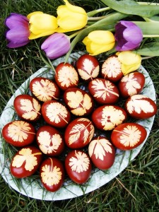 Traditional am vopsit si ouale impreuna cu tata, in foi de ceapa si ornate cu frunze.
