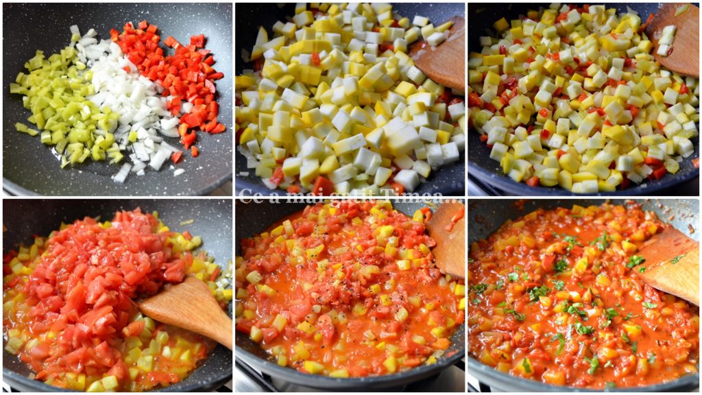- Pentru pregatirea sosului de legume folosim o tigaie adanca pe care o punem pe foc si adaugam pe rand ceapa si ardeiul tocat, apoi dovlecelul taiat cubulete si la final rosiile decojite.