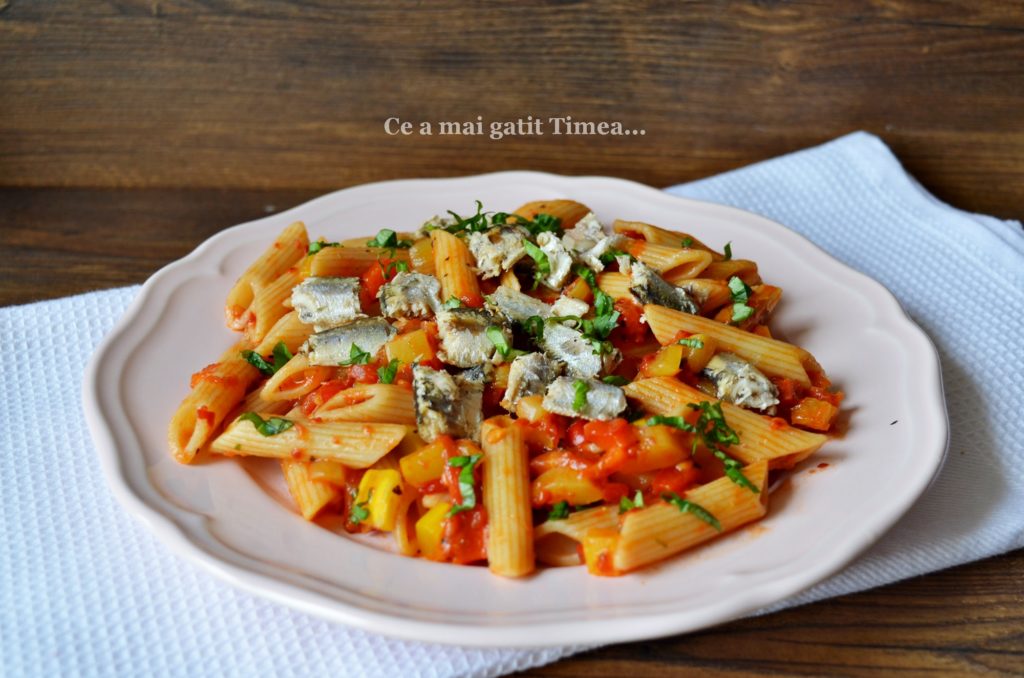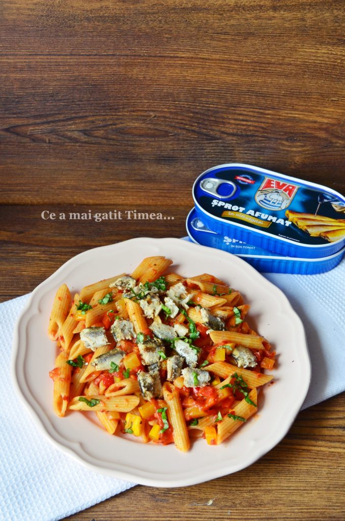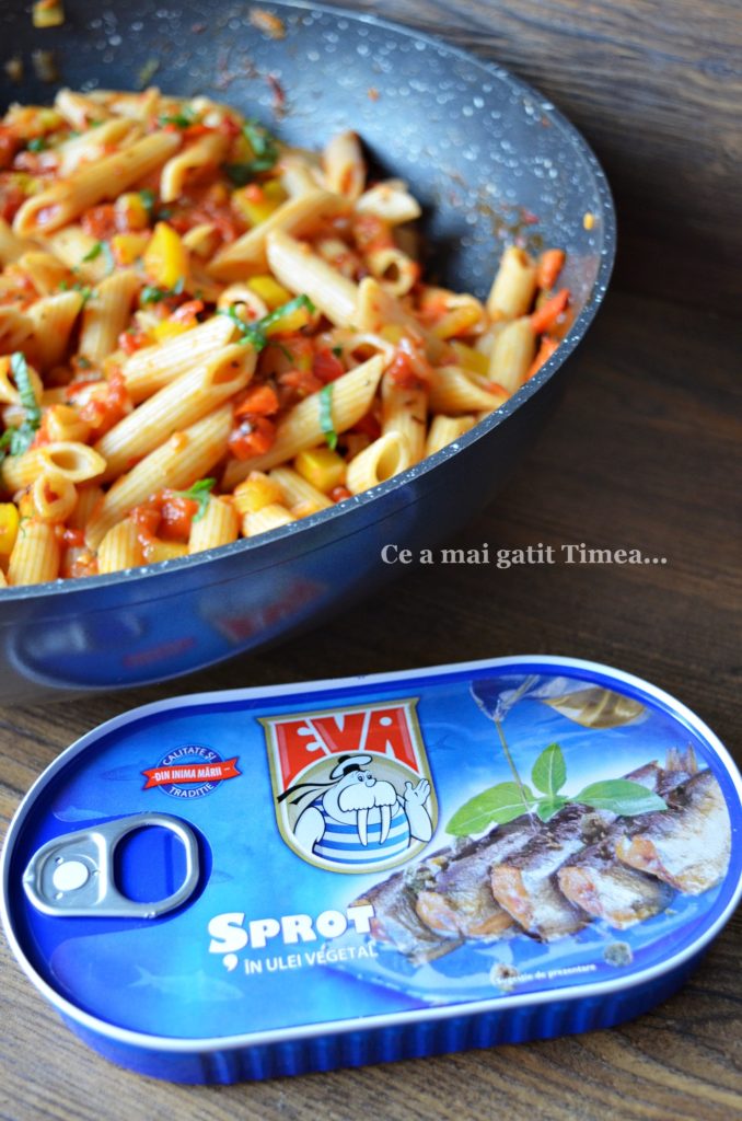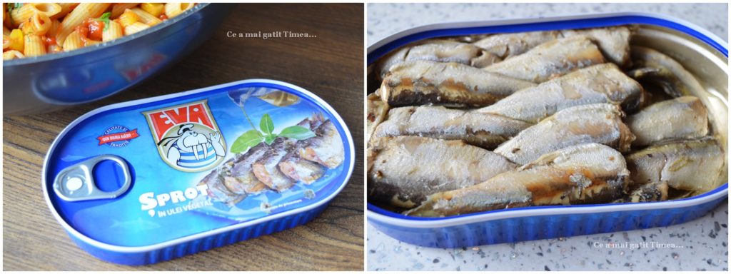 - La servirea pastelor putem adauga peste din conserva, eu am adaugat sprot in ulei de la Podravka
