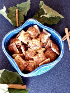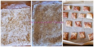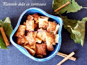 Peste foaia intinsa am presarat zahar brun si cu sucitorul am apasat putin peste zahar ca sa intre zaharul in aluat. Apoi am presarat scortisoara si am decupat din aluat multe patratele.