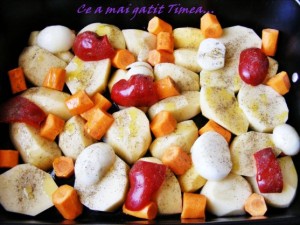 Ungem o tava cu putin ulei de masline apoi asezam cartofii taiati in doua, morcovii taiati rondele, ceapa taiata in 3 si gogosarii felii. Saram si piperem si stropim totul cu ulei de masline.