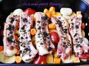 Asezam carnea peste legume acoperim cu folie de Al. si dam la cuptor la 190 grade timp de aprox 1 ora.