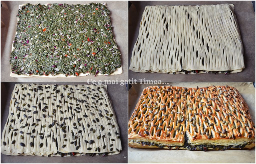 - Asezam prima foaie de aluat intr-o tava tapetata cu hartie de copt si cu o lingura intindem umplutura de spanac. Cea de a doa foaie o crestam cu rola speciala de crestat aluaturi si o asezam peste umplutura.
