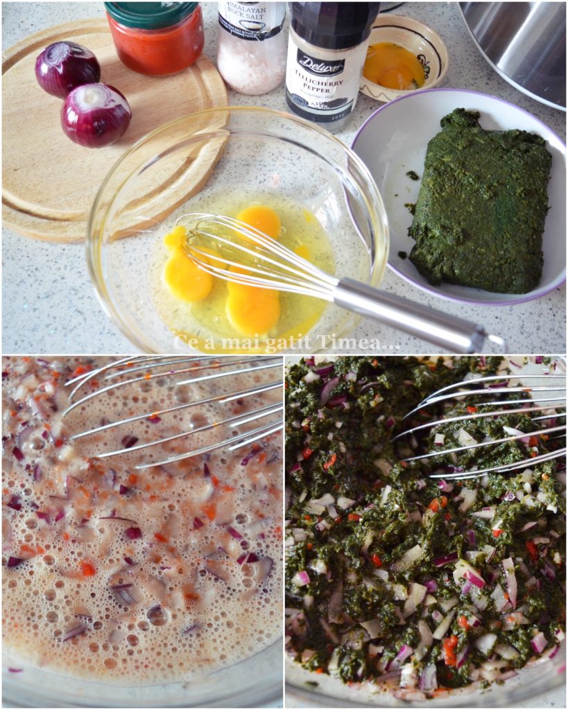 - Intr-un bol batem ouale cu ajutorul unui tel adaugand sarea, piperul, ceapa si pasta de gogosari. La final incorporam spanacul complet decongelat si stors de apa.
