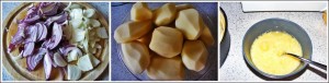 – se curata ceapa si cartofii si batem ouale intr-un bol.