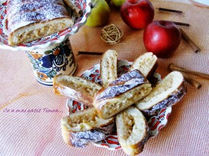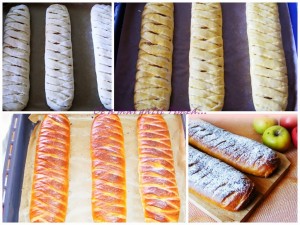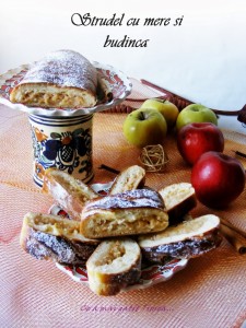 E un strudel facut din aluat dulce, dospit, iar merele sunt amestecate cu o budinca de vanilie pentru a avea o umplutura mai cremoasa. Sunt mere proaspat culese de la tara 🙂