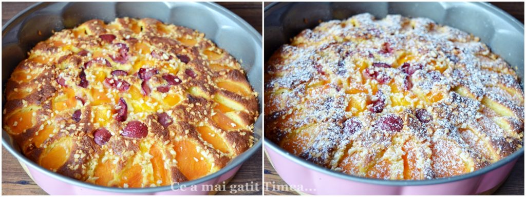 - Fructele le spalam si le indepartam samburii. Caisele le taiem felii si asezam feliile de jur imprejur pe margine. Apoi un rand de cirese iar in mijloc punem bucatele de caise si cirese taiate.