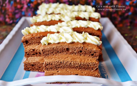 Daca cautati o prajitura simpla doar cu ciocolata, ati ajuns in locul potrivit, la reteta potrivita. Un blat simplu de cacao si o crema gustoasa de ciocolata, iar pentru un aspect frumos un plus de frisca deasupra.