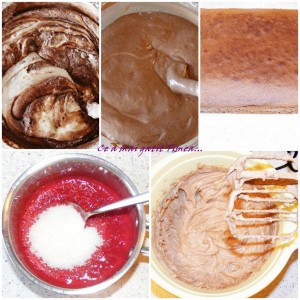 Taiem blatul in doua. Prima foaie o ungem cu jeleul de fructe si lasam asa 20 min. sa se traga putin in blat. Punem apoi crema peste jeleu si cu grija nivelam. Asezam al doilea blat care vine apoi insiropat cu siropul de zmeura.