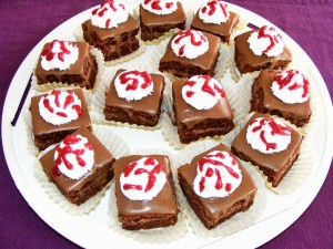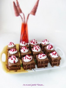 Crema pusa deoparte o incalzim in cuptorul cu microunde timp de 15-20 sec. Cu o lingurita punem glazura calduta pe fiecare cub de prajitura in parte, lasand sa curga si pe margini.