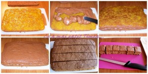 Taiem blatul in doua. Prima foaie o ungem cu trei sferturi din jeleul de citrice si lasam asa 20 min. sa se traga putin in blat. Punem apoi crema de ciocolata peste jeleu si nivelam cu grija.. Asezam al doilea blat peste care intindem restul de jeleu si crema pusa deoparte.