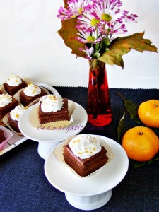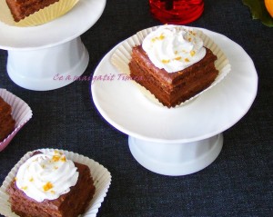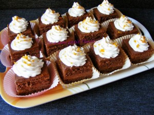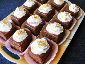 Mixam frisca pana obtinem consistenta dorita apoi cu un pos formam cate un mot de frisca pe fiecare bucata de prajitura peste care presaram coaja de portocala.
