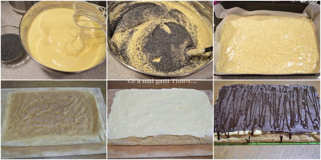 - Mixam albusurile spuma cu un varf de sare. Adaugam zaharul si zaharul vanilat, alternand cu cele 4 linguri de lapte si mixam 3-4 minute pana se topeste zaharul. Apoi adaugam galbenusurile si uleiul mixand dupa fiecare. La final incorporam faina amestecata cu praful de copt si macul folosind o spatula.