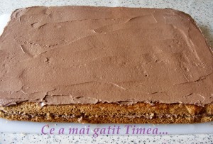 Punem trei sferturi din crema si nivelam, apoi asezam a doua foaie deasupra, o insiropam si pe aceasta si ungem cu restul de crema.