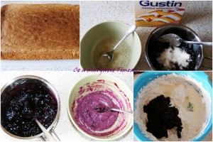 Crema: punem gelatina la hidratat in 50 ml apa rece. Afinele le amestecam cu cele doua linguri de zahar si punem pe foc pana se topeste zaharul apoi adaugam amidonul si amestecam pana se ingroasa (2-3 minute).