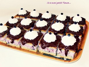 Nu stiu la voi cum e, dar la noi nu prea e weekend fara ceva dulce. Si cum mi-am propus sa consum incet, incet fructele din congelator, a venit randul afinelor. Si cred ca am facut o alegere tare buna facand o prajitura insiropata, cu mousse de afine si glazura de ciocolata. Nu e foarte dulce, dar satisface din plin dorinta de a manca ceva dulce 🙂