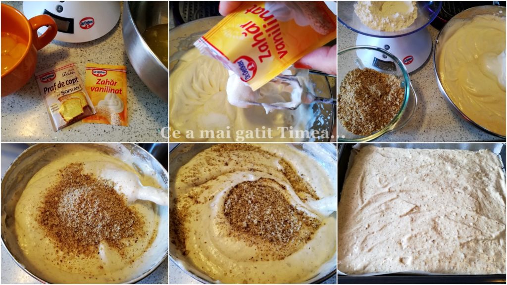 - Mixam albusurile spuma cu un varf de sare. Adaugam apoi zaharul si zaharul vanilat si mixam pana se topeste zaharul. Apoi urmeaza cele 4 linguri de apa fierbinte, galbenusurile si uleiul, mixand dupa fiecare.