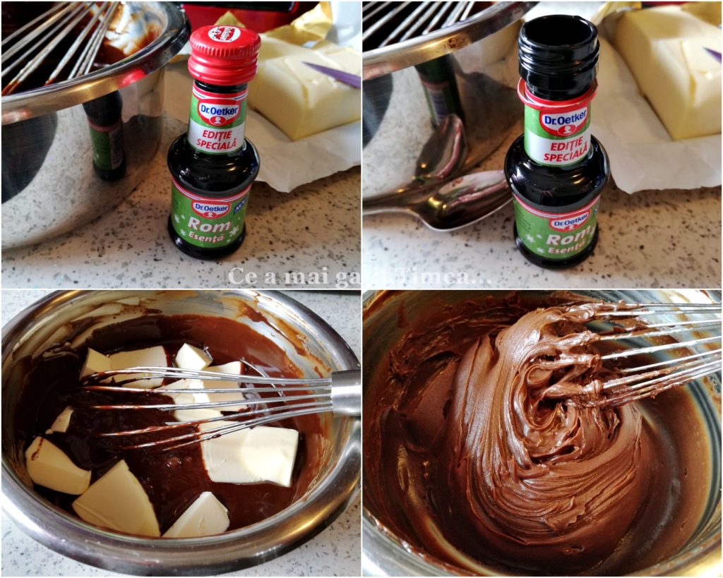 - Amestecam intr-un vas frisca lichida neindulcita cu zaharul si punem vasul pe foc pana da in clocot. Luam de pe foc si adaugam ciocolata bucatele si amestecam pana se topeste ciocolata. Adaugam esenta de rom si untul la temperatura camerei si amestecam cu telul pana la omogenizare. Dupa ce s-a racit putin, dam crema la frigider timp de o ora. Din cand in cand amestecam in crema.