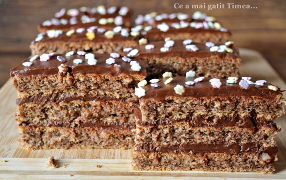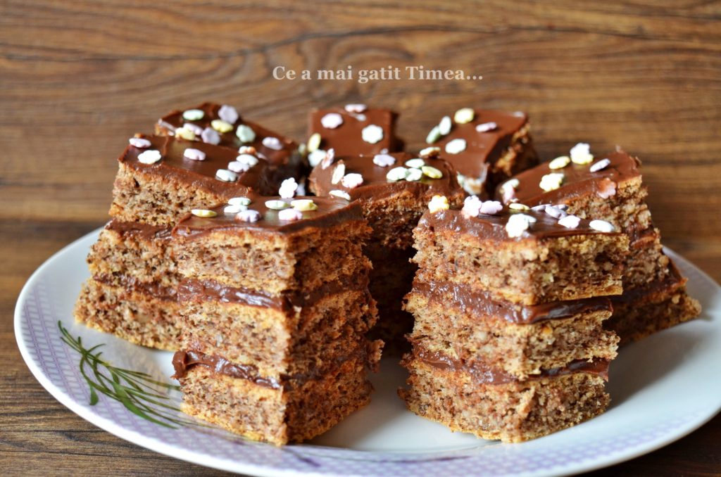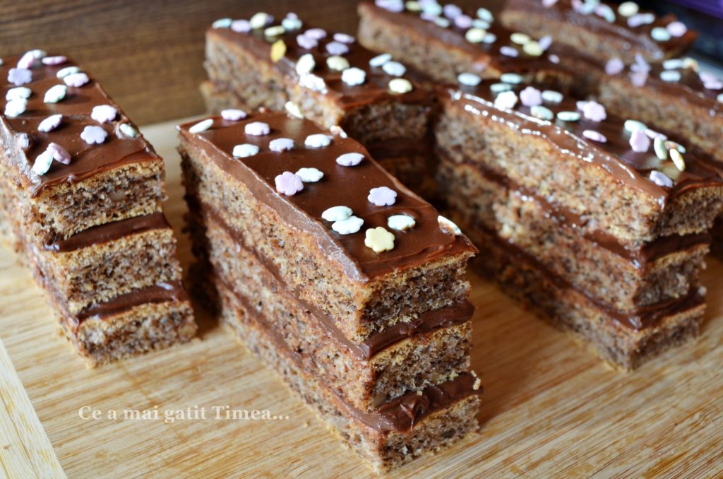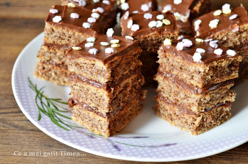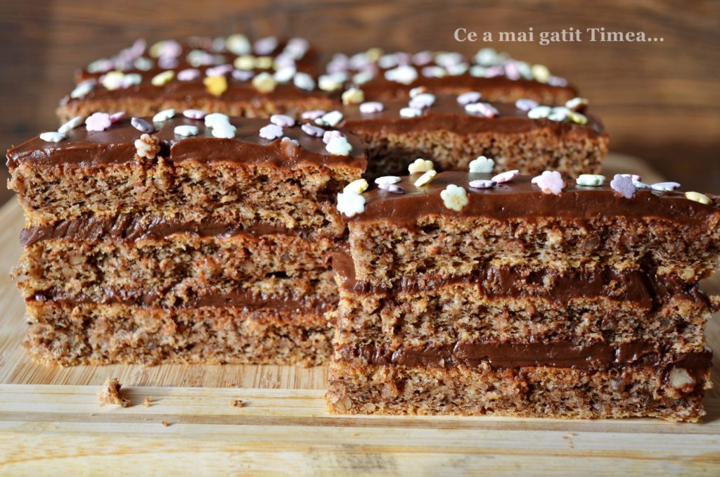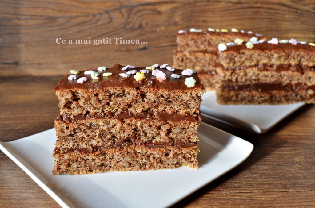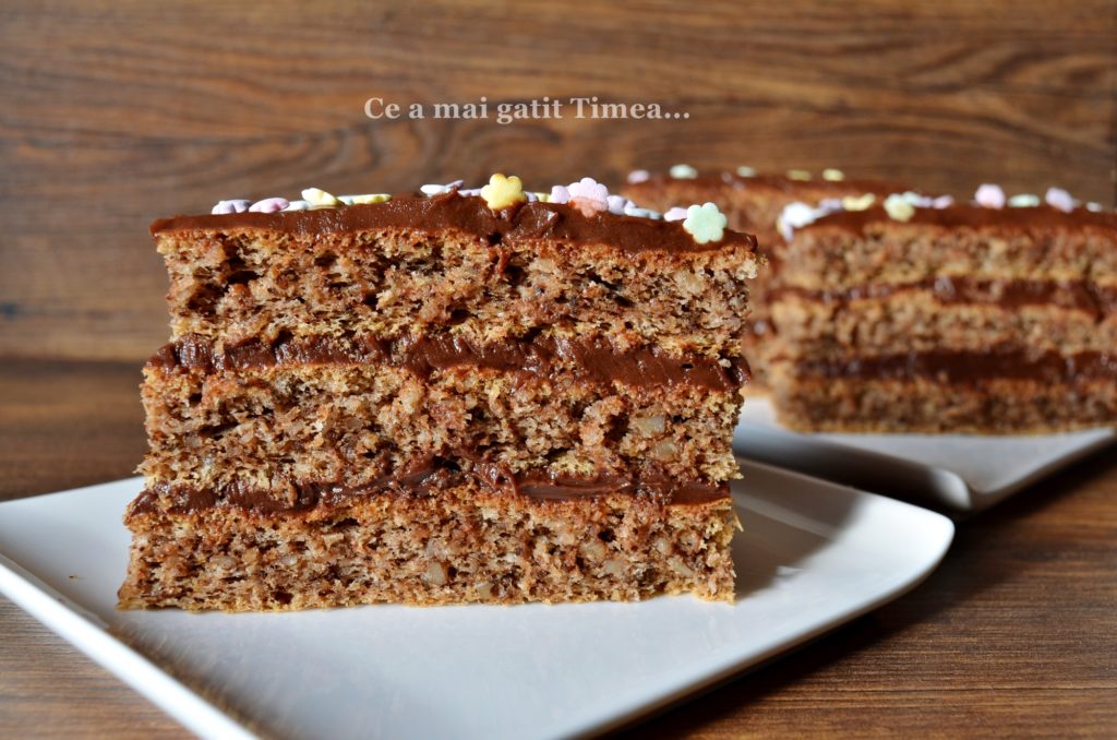 Prajiturile cu ciocolata sunt iubite in fiecare familie si nici a mea nu e o exceptie desi eu personal prefer crema de vanilie :), dar pentru ca sunt in minoritate, de sarbatori nu lipseste din casa o prajitura cu ciocolata. Blatul folosit la aceasta prajitura este unul cu nuca si cand vine vorba de blaturile cu nuca, aici suntem cu totii de acord pentru ca ne place la fel de mult.