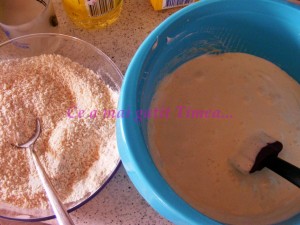 Pentru blat: batem albusurile spuma cu mixerul, adaugam zaharul si mai mixam 2-3 minute. Adaugam apoi pe rand mixand in continuare: galbenusurile, uleiul si laptele. La final incorporam folosind o spatula, faina amestecata cu nuca de cocos si praful de copt.