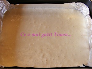 Turnam in tava tapetata (tava: 22/30 cm) si dam la cuptorul preincalzit la 175 grade, timp de 25-30 min.