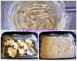 Pentru primul blat: batem cu un tel ouale intregi cu zaharul , apoi adaugam untul la temperatura camerei si la final faina amestecata cu praful de copt. Amestecam bine cu telul pana incorporam toata faina. Obtinem un aluat lipicios pe care il intindem cu o lingura intr-o tava unsa cu unt si tapetata cu faina. (tava folosita de mine: 22/30 cm)