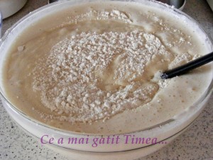 Dam la cuptorul preincalzit la 175-180 de grade timp de 30-35 minute. Facem testul cu scobitoarea pt a ne asigura ca blatul este copt.