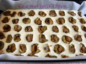 Asezam jumatatile de prune deasupra si in fiecare bucata de pruna punem putin zahar si praf de scortisoara.