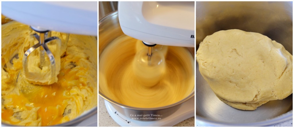 - Pentru foi mixam untul cu zaharul si cele 3 galbenusuri, smantana/laptele apoi incorporam treptat faina amestecata cu sarea si praful de copt.